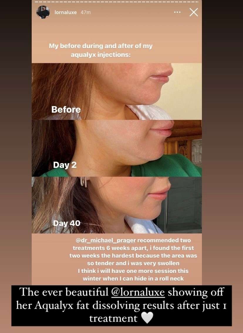 One of the treatments offered by Underlining Beauty, which is becoming more and more popular, is fat dissolving. We do this using a product called Aqualyx®. It’s become a hit with celebrities such as the beautiful Lorna Luxe to help tackle stubborn fat around the double chin area.